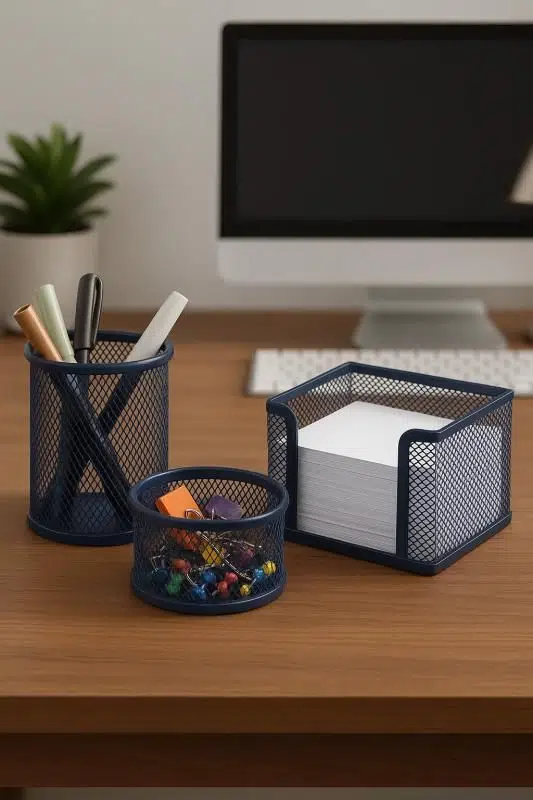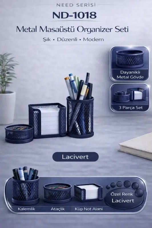 Ofis düzeninizi şıklıkla tamamlayın! Masaüstü Lacivert Kalemlik Seti, masanızı hem düzenli tutar hem de estetik bir görünüm kazandırır. Kaliteli malzeme yapısı ve zarif tasarımıyla dikkat çeken bu set, çalışma alanlarınızda işlevsellik ve şıklığı bir arada sunar.