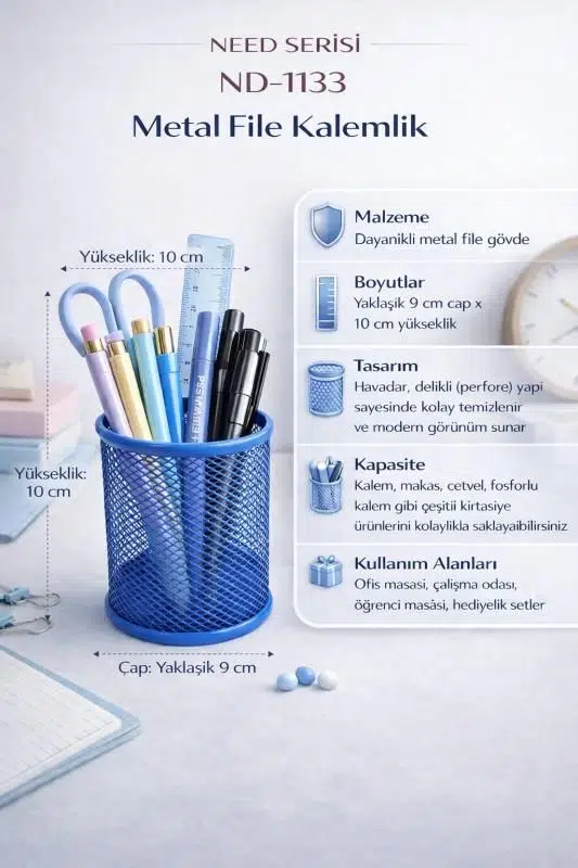 Masanıza zarif bir dokunuş katmak ister misiniz?Need Perfore File Mavi Kalemlik, şık tasarımı ve işlevsel yapısıyla ofis, okul veya ev kullanımı için ideal bir organizasyon çözümüdür.