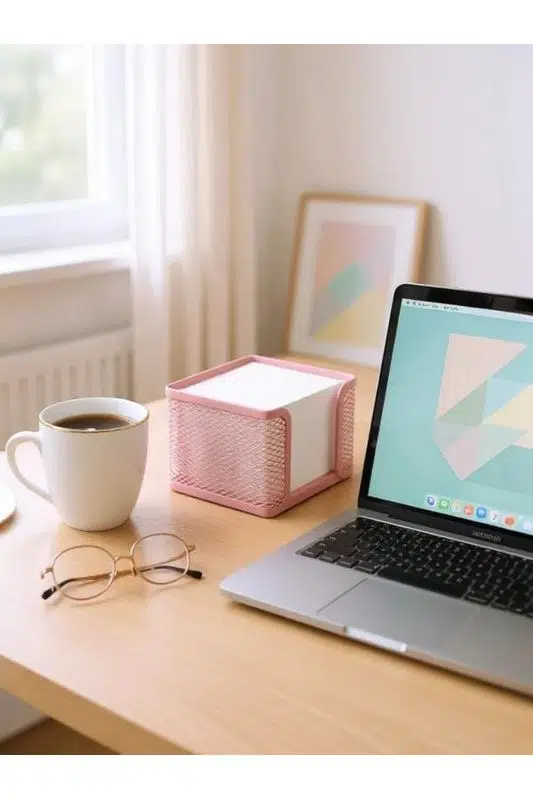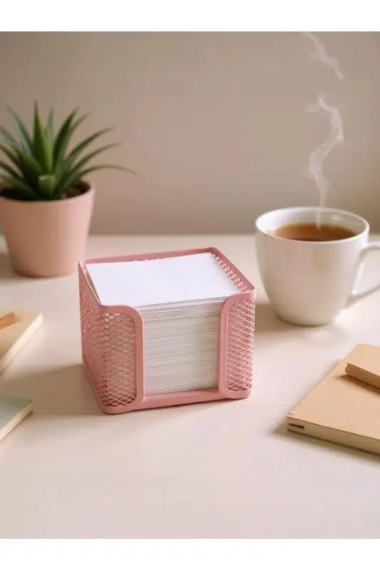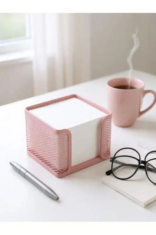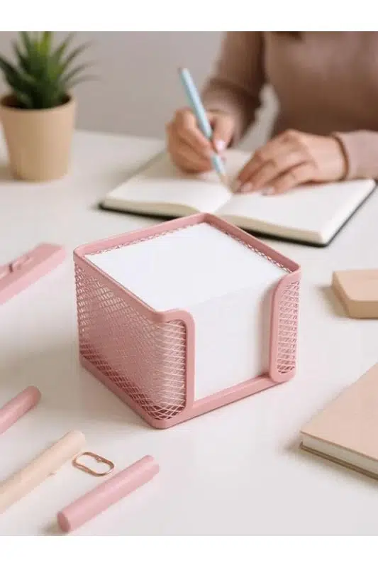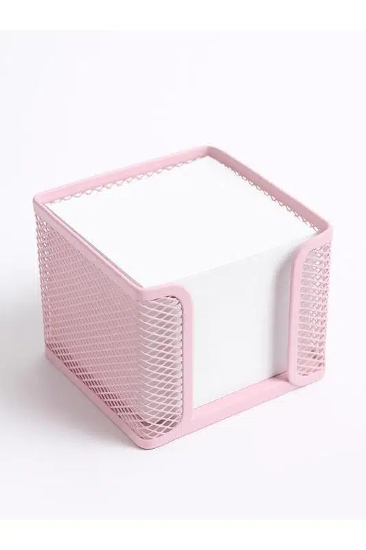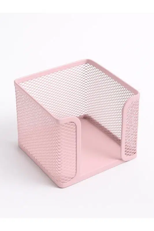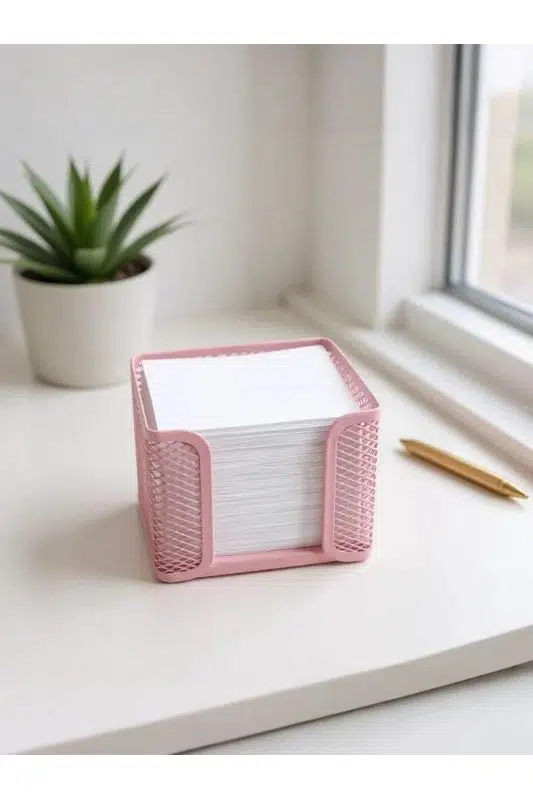 Masanızda düzen ve estetik bir arada! Zarif toz pembe rengi ve sağlam metal gövdesi ile bu küp notluk, not kâğıtlarınızı düzenli bir şekilde saklamanıza yardımcı olur. Hem iş hem de ev ortamında dekoratif bir masa aksesuarı olarak öne çıkar.