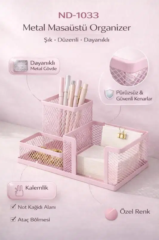 Need ND-1033 metal mesh masaüstü organizer, çalışma alanınızı düzenli ve şık hale getirmek için tasarlanmış çok amaçlı bir düzenleyicidir. Dayanıklı metal örgü yapısı ve modern tasarımıyla kalem, not kağıdı, makyaj malzemeleri veya küçük ofis ekipmanları için ideal bir saklama alanı sunar.