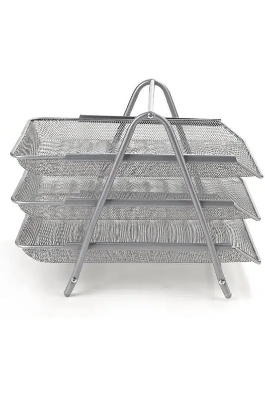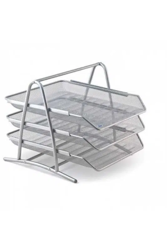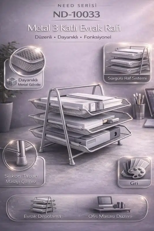 Metalik Gri Hareketli 3’lü Metal Evrak Rafı, masaüstü belgelerinizi kolayca kategorize etmenize ve erişilebilir bir şekilde saklamanıza olanak tanır. Dayanıklı metal gövdesi sayesinde uzun ömürlü kullanım sunarken, hareketli raf sistemi sayesinde dosya ve evraklara zahmetsiz erişim sağlar.