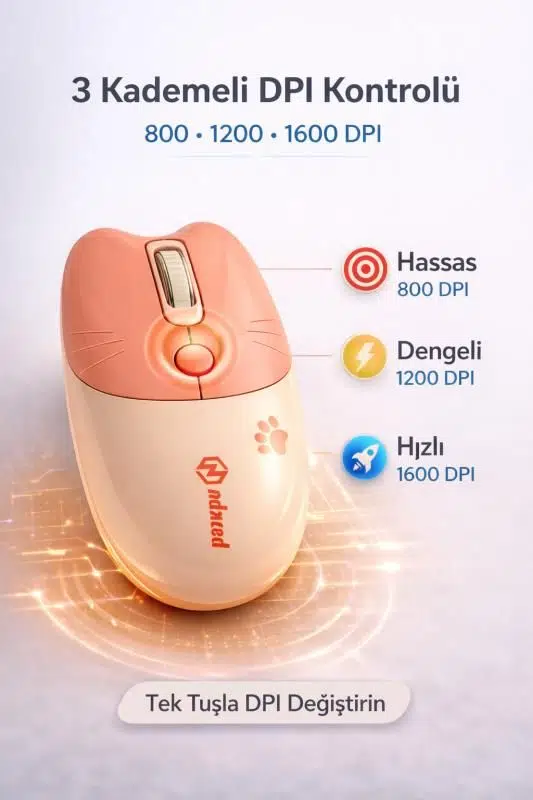 Ayarlanabilir DPI: 3 DPI'lı (800/1200/1600) bu kız fare, 32,8 ft'e kadar etkili çalışma mesafesiyle tak ve çalıştır özelliğindedir. Güç tasarrufu ve otomatik uyku modu ile tasarlanmıştır.
