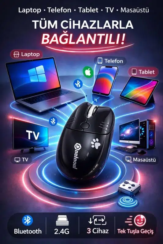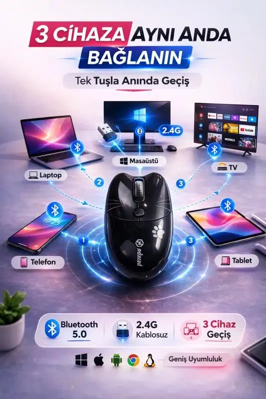 Çift Mod: Bu kablosuz fare, BT 5.1 veya 2.4GHz kablosuz bağlantıyı destekler ve 2 cihaza bağlanabilir, sadece tek bir tıklamayla iki cihaz arasında geçiş yapın.