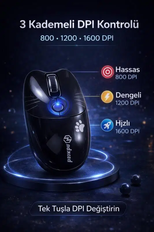 Ayarlanabilir DPI: 3 DPI'lı (800/1200/1600) bu kız fare, 32,8 ft'e kadar etkili çalışma mesafesiyle tak ve çalıştır özelliğindedir. Güç tasarrufu ve otomatik uyku modu ile tasarlanmıştır.